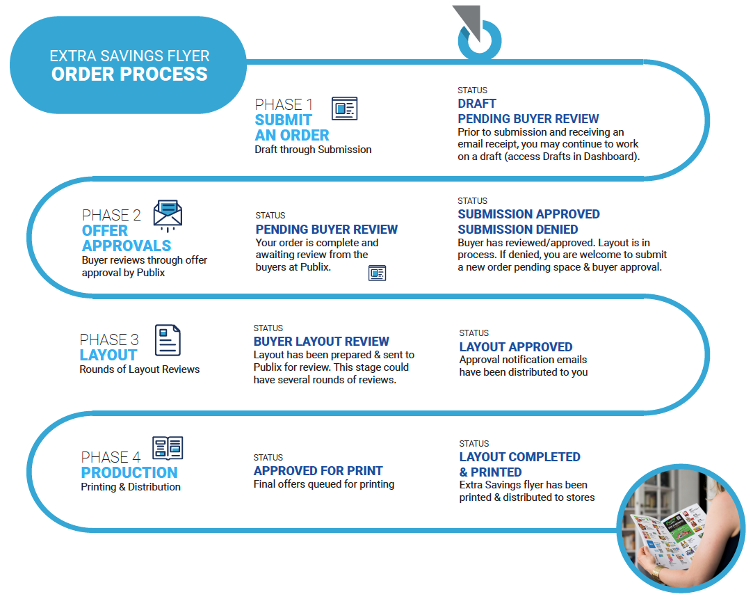 An order on the Publix Extra Savings Portal consists of the dates, placement options, brand enhancement options, offers, and artwork that make up a single placement in an Extra Savings flyer. This could be a simple price point or coupon, or it could be a quarter, half, or full page that contains multiple offers in one advertising spot.